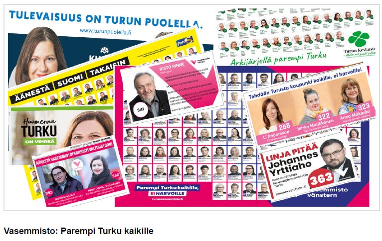 Maksullisesta printtimediasta ovat tällä kertaa poissa monet pienet ehdokaslistat. Ne ovat kuitenkin olemassa katumainoksista. Monet niistä asettuvat vaihtoehdoksi entisille puolueille ja uusia tulokkaita on yllättävän paljon ympäri maata. Tämä viittaa siihen, että tyytymättömyyden pohjavirtoja löytyy. Tutut ja näkyvät ehdokkaat voivat kanavoida tyytymättömien kansalaisten ääniä ja saada paikkoja valtuustoissa. Seuraavassa havaintoja turkulaisesta kattauksesta.