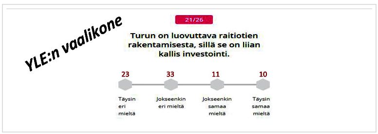 Päätin yrittää ottaa selvää siitä, mistä kaikesta puhutaan, kun puhutaan Turun ratikasta. Kävin läpi Vasemmistoliiton turkulaisten ehdokkaiden vastauksen YLE:n vaalikoneessa. Yle oli laittanut turkulaisille seuraavan väitteen (numero 21): ” Turun on luovuttava raitiotien rakentamisesta, sillä se on liian kallis investointi.” Vastaus oli pakko valita neljästä vaihtoehdosta: joko olit täysin tai jokseenkin samaa mieltä tai eri mieltä. Keskimmäisiä vaihtoehtoja, kuten ”ei osaa sanoa” tai ”se on monimutkainen kysymys”, ei ollut. Sen sijaan oli kyllä mahdollisuus täydentää vastausta sanallisesti. Vasemmistoliiton ehdokkaista 77 oli vastannut. Jakautuma oli seuraava: Täysin raitiotiestä luopumisen kannalla oli 10 ja täysin raitiotiehankkeen puolella oli 23 vastaajaa. Lievemmin ja ehdollisemmin samaa tai eri mieltä oli 44 vastaajaa, heistä enemmistö oli hankkeen säilyttämisen puolella.