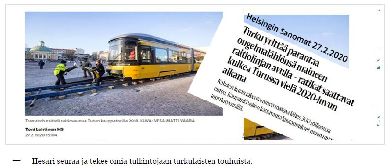 Useampi äänestäjä onkin ilmoittanut, että muuten ehdokas on valittu, mutta kanta ratikkaan on vielä selvitettävä. Turun raitiotie nousee kärjekkäästi esille useasta syystä. Muutama ehdokas on tehnyt sen vastustamisesta äänekkään puheenaiheen. Myös mediassa ja vaalikoneissa sitä käsitellään puolesta tai vastaan -asiana. Ratikka on yhtä aikaa helppo ja kimurantti asia. Puhumalla siitä törmää kuitenkin samalla moneen muuhun kiisteltuun asiaan, kuten kunnan taloudenpitoon, kaupungin kehittämisen visioon, ympäristöarvoihin ja kaupungin suunnitteluun.