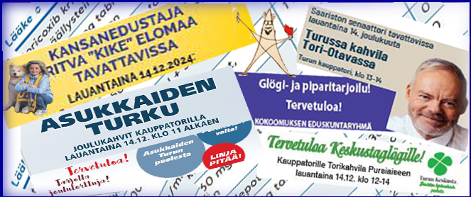 Lauantai 14.12.2024 on oikea kunnallisvaalien käynnistymispäivä, ainakin jos uskoo Turun Sanomien mainoksia. Kolmen kokoomukselaisen (Pauli, Ville, Milla), kahdeksan keskustalaisen ja perussuomalaisen Kiken voi tavata glögin merkeissä. Edellisen päivän lehdessä vielä vasemmistoliiton valtuustoryhmästä erotetut Jyrki ja Elina lupasivat tarjota lauantaina joulukahvia ja torttuja. Turun Sanomien mainostulot ovat ilmeisesti taatut vaaleihin saakka.13.12.2024