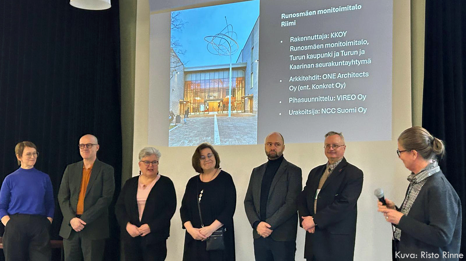 Kuvassa Runosmäen monitoimitalo Riimin rakennuttajat ja suunnittelijat saivat laadukkaan kaupunkirakentamisen palkinnon Bryggman-seuran seminaarissa helmikuussa 2025.