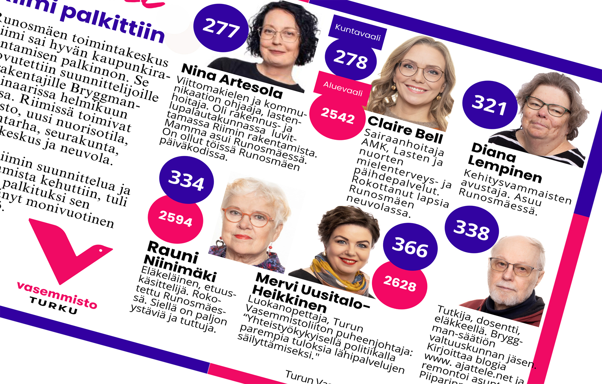 Kun Runosmäen yhdistys paikkasi talouttaan tarjoamalla mainospaikkoja lehdessään Ruutisessa, tarjouduin ja sain houkuteltua muitakin Runosmäkeen kytkeytyviä ehdokkaita Vasemmistoliitosta. Kun viisikkomme muuttuu kuusikoksi (Runosmäessä asuva Diana Lempinen tuli mukaan), järjestelin naamoja taitto-ohjelmassa ja onnistuin hävittämään oman nimeni. En edes itse huomannut sitä ennen kuin Nina Artesola huomasi sen puuttuvan. Silloin lehti oli jo painossa. Onneksi se oli oma nimeni eikä kenenkään muun ja onneksi kuva ja numero olivat lehdessä. Saa siinä sitten äänestäjä miettiä, onko tuo vanha mies Pekka, Mikko vai Jukka.