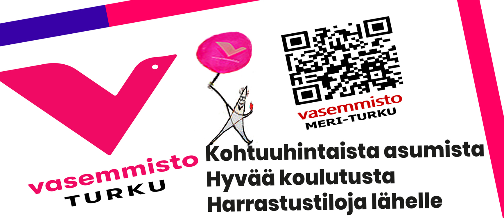 Toinen moka sattui jo aikaisemmin. Bussifirmojen ja pysäkkien mainospintoja myyvä yritys tarjosi mainostilaa. Ehdotin Meri-Turun yhdistykselle, että tehtäisiin yhdistyksen ehdokkaiden yhteinen mainostarra bussien tuolien selkämyksiin. Kun valmistelin mainosta, niin selvisi, että en ollutkaan tilaamassa postikortin kokoista tarraa bussien tuolien taakse, vaan 170 senttiä korkeaa mainosta jollekin arpomalla määräytyvälle bussipysäkille. Taas piti viritellä kuvia ja tunnuksia uudelleen taitto-ohjelmassa. Silmien korkeudelle piti siirtää Vasemmiston tunnus ja Meri-Turun uusi QR-koodi. (Katso kuva jutun alussa.)![]()