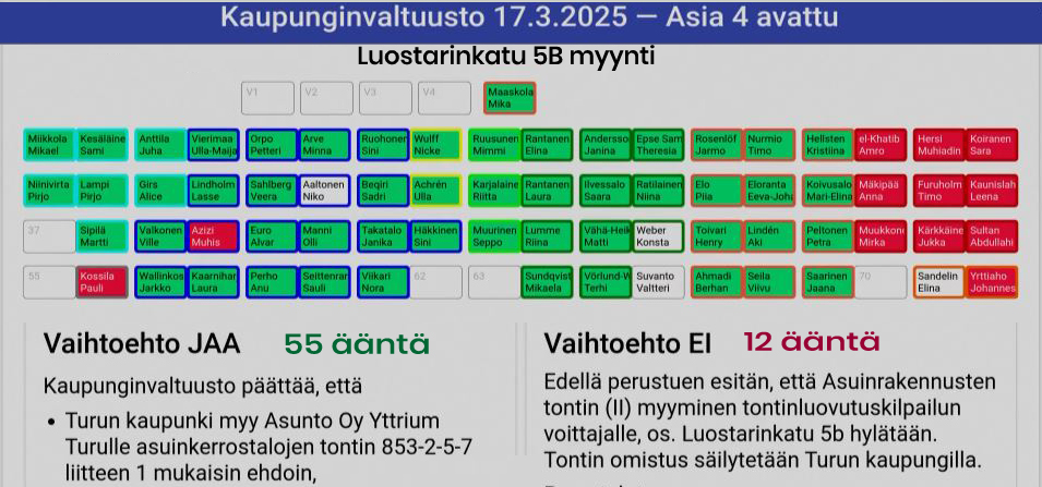 Valtuusto hyväksyi äänin 55 - 12 tontin myynnin.
